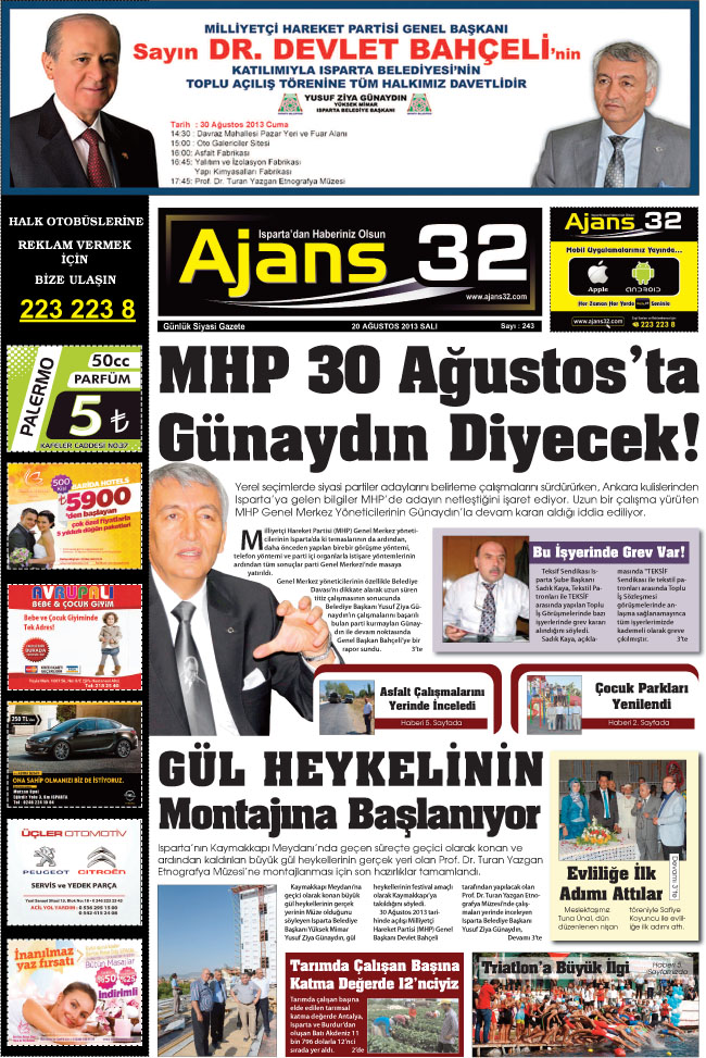 Dün MHP Lideri Isparta çeşitli açılışlara katıldı ve akşam Atatürk stadyumunda düzenlenen konserde de partisinin Belediye Başkan adayını açıkladı. Bizim 20 Ağustos'ta duyurduğumuz ismi, Bahçeli onbinlerce Ispartalının huzurunda zikretti.